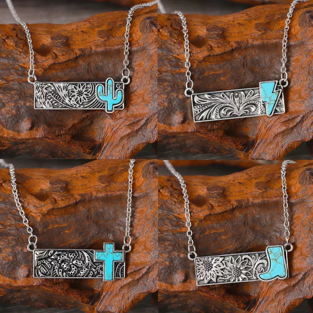 Boho Turquoise Cactus Cross Lightning Necklace Western Cowboy Retro Creative Square Pendant