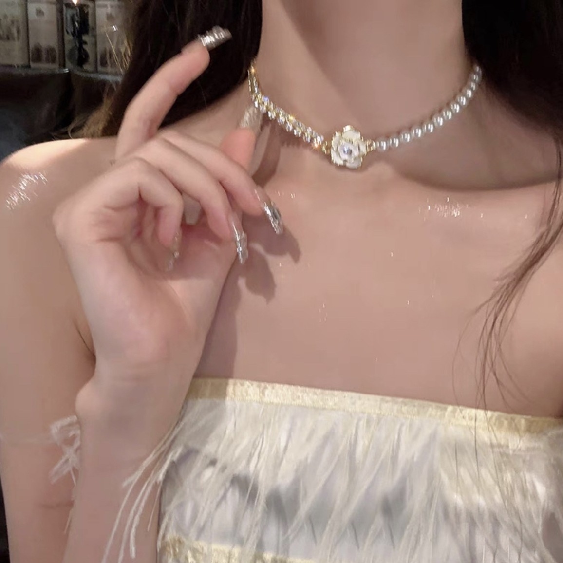 Retro Camellia Versatile High-End Pearl Necklace Women's Niche Korean Simple Clavicle Chain Elegant Korean Style Necklace