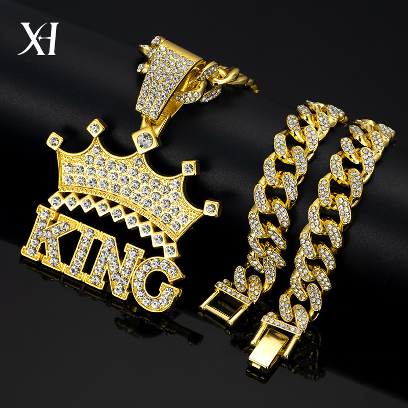Cross-border New King Crown Pendant Alloy Full Diamond Cuban Chain European and American Hip Hop Necklace Personalized Trendy Men's Jewelry