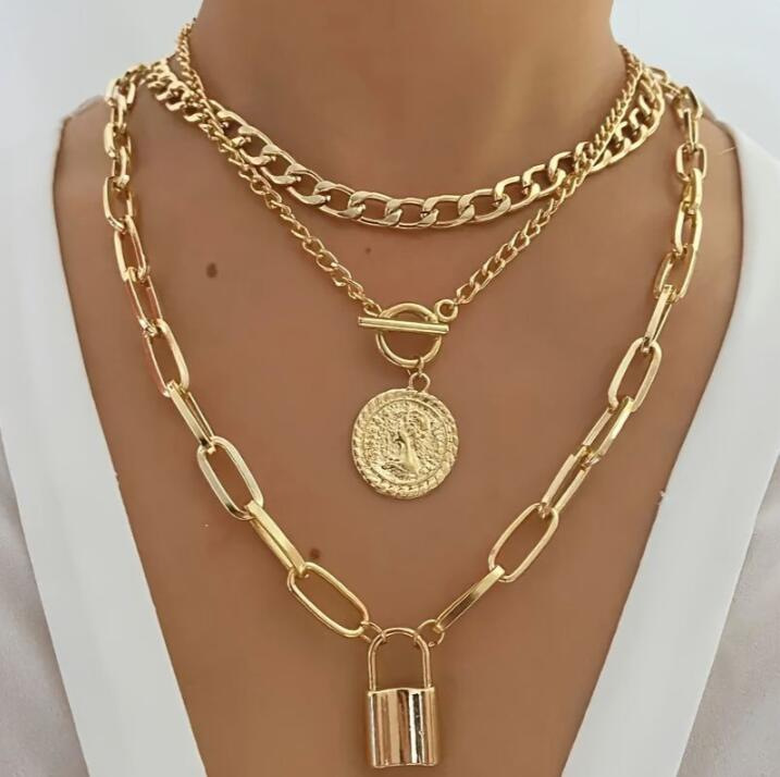 European and American Cross-Border Best-Selling Women's Necklace Set Accessible Luxury Elegant Embossed Round Plate Pendant Ot Buckle Three-Layer Necklace
