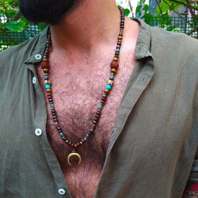 Niche Design Imitation Turquoise Wood Beads Walnut Beaded Necklace Men's Retro Moon Pendant Long Necklace Sweater Chain