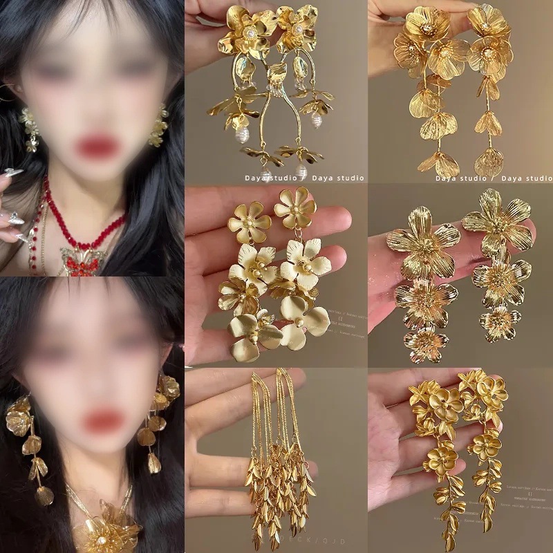 Gold-plated Broken Leaves ~ New Chinese Style National Style Golden Flower Tassel Earrings Women's Light Luxury High-end Elegant Retro Earrings