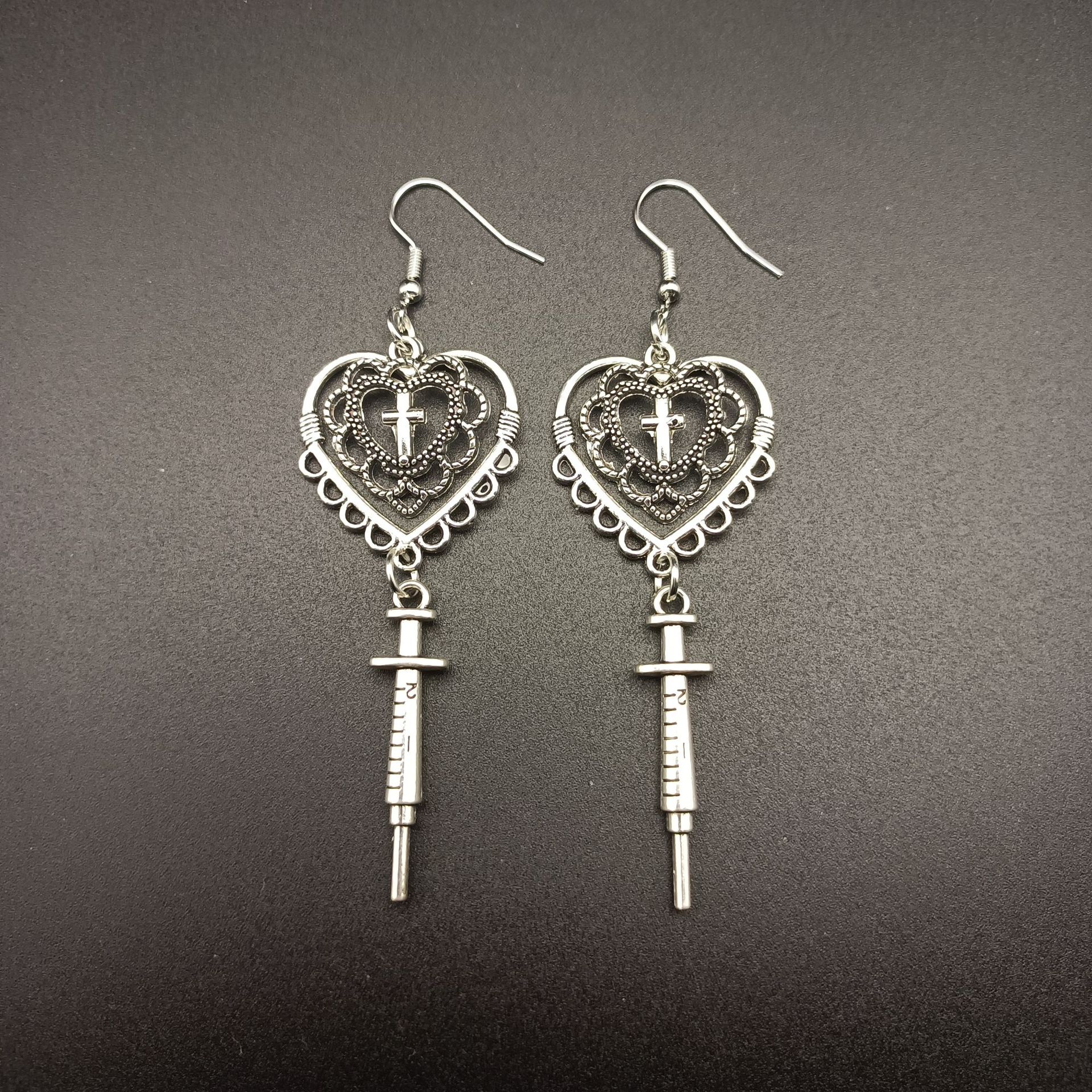 Dark vintage style Gothic Baroque heart syringe thermometer Halloween niche design earrings