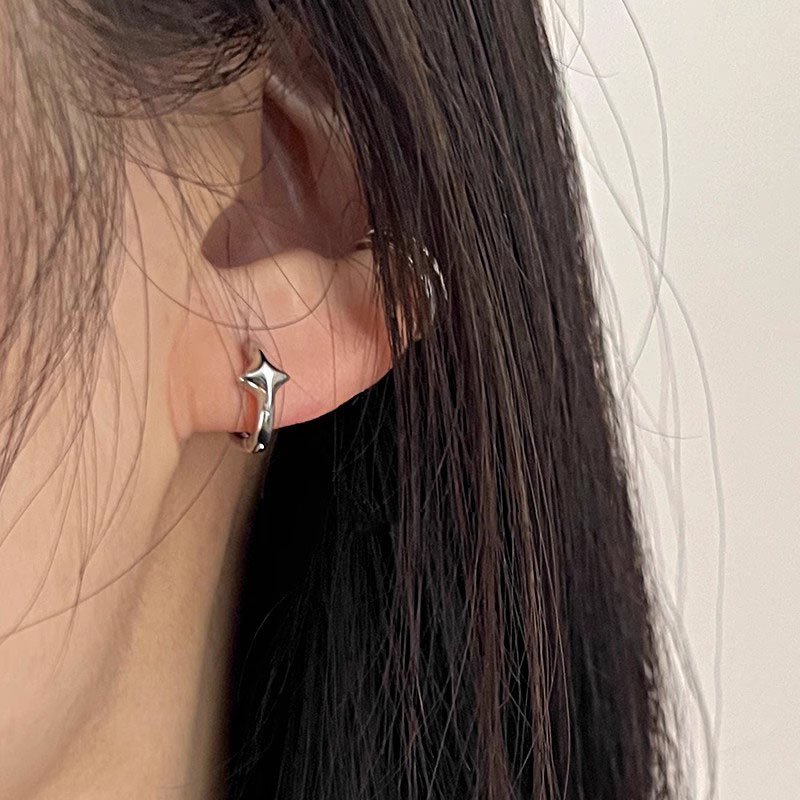 S925 Sterling Silver Four Mans Star Ear Buckle Women's Cold Style Simple Cross Star Plain Hoop Earrings Mini Exquisite Small Ear Ring