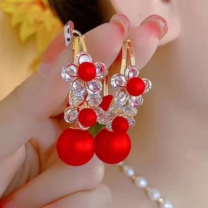 2024 New Red Pearl Pendant High-End Elegant French Style Earrings for Women Niche Versatile Tassel