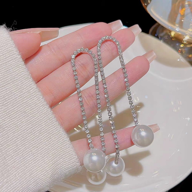 High-end super shiny pearl simple tassel earrings TikTok same style full diamond pearl earrings elegant all-match earrings for women