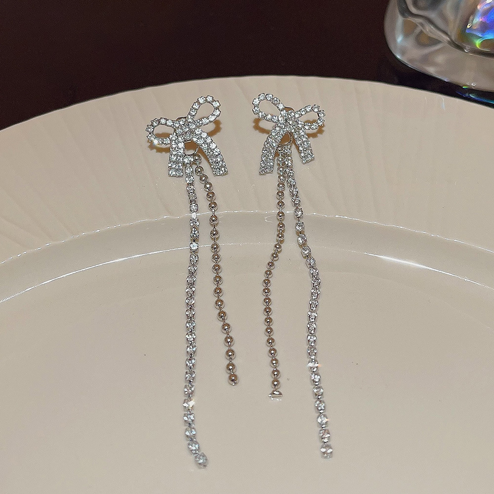 European and American Style Diamond Bow Earrings High-end Exaggerated Long Tassel Earrings Style Super Flash Fashion Earrings