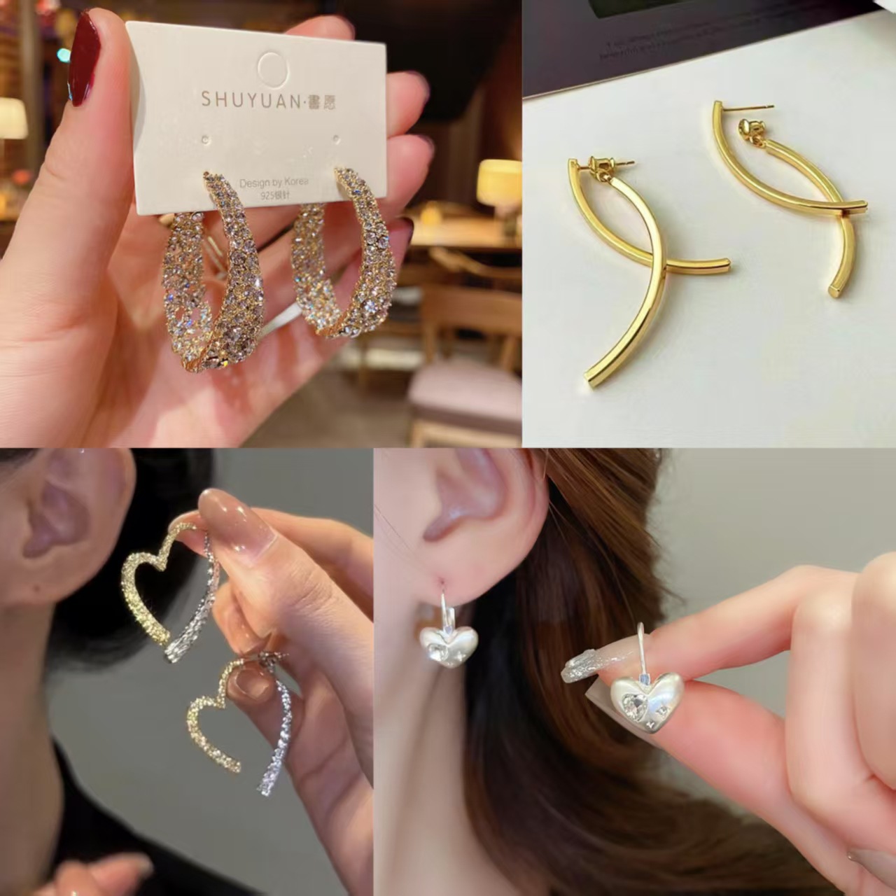 Korean and Japanese Style Versatile Diamond-Studded Long Semi-Circular Arc Cross Earrings Metal Brushed Heart Earrings Accessories