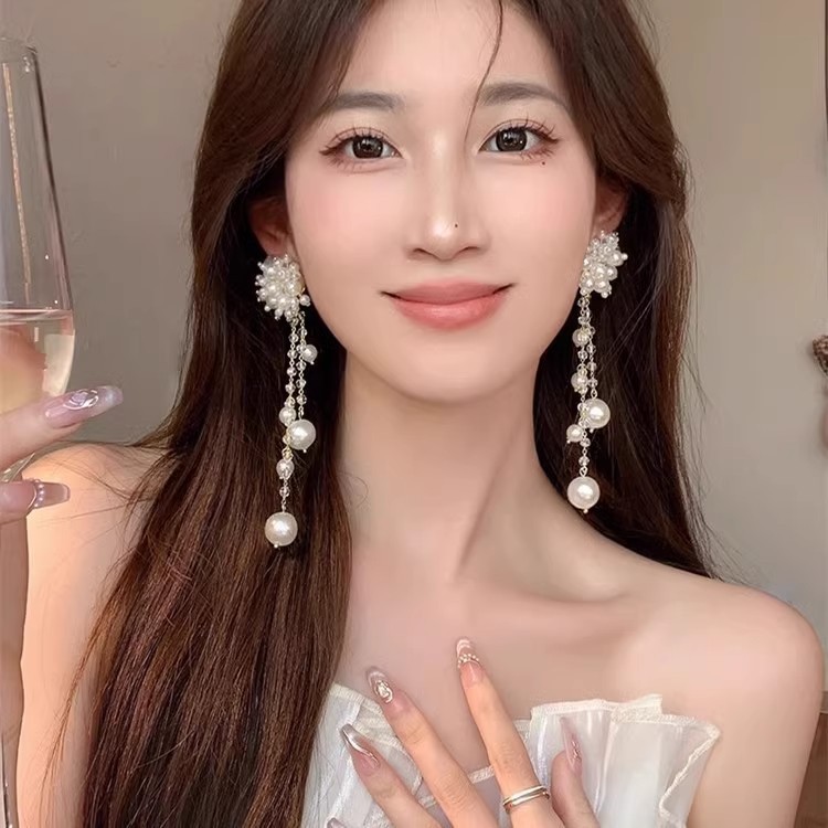 Retro Pearl Long Tassel Earrings, Exaggerated Large Earrings, High-End, Elegant, Elegant, Bridal Wedding Banquet Earrings