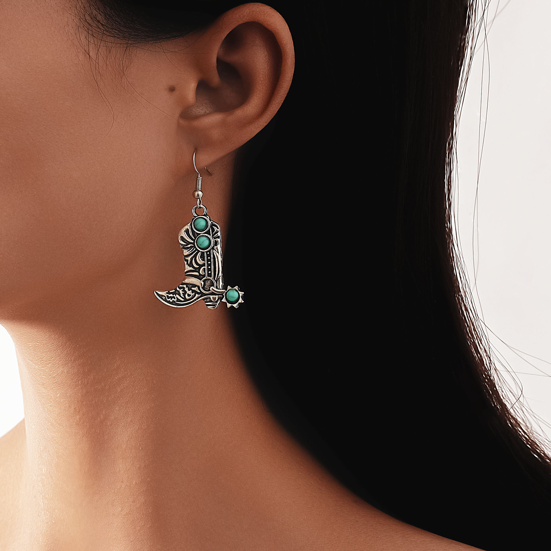 European and American New Retro Cross-Border Earrings, Personalized Turquoise Western Cowboy Alloy Boots Shaped Earrings
