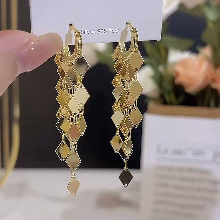 Niche Design High-grade Golden Diamond Sequins Tassel Earrings Women's Fashion Elegant All-match Round Face Slimming Earrings