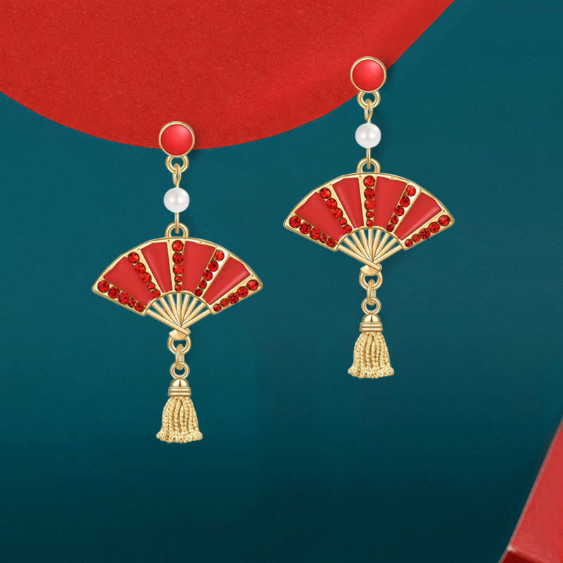 Chinese Style New Arrival Enamel Fan-shaped Tassel Earrings Unique Fashion Retro New Chinese Style Red Oil Drop Fan Earrings