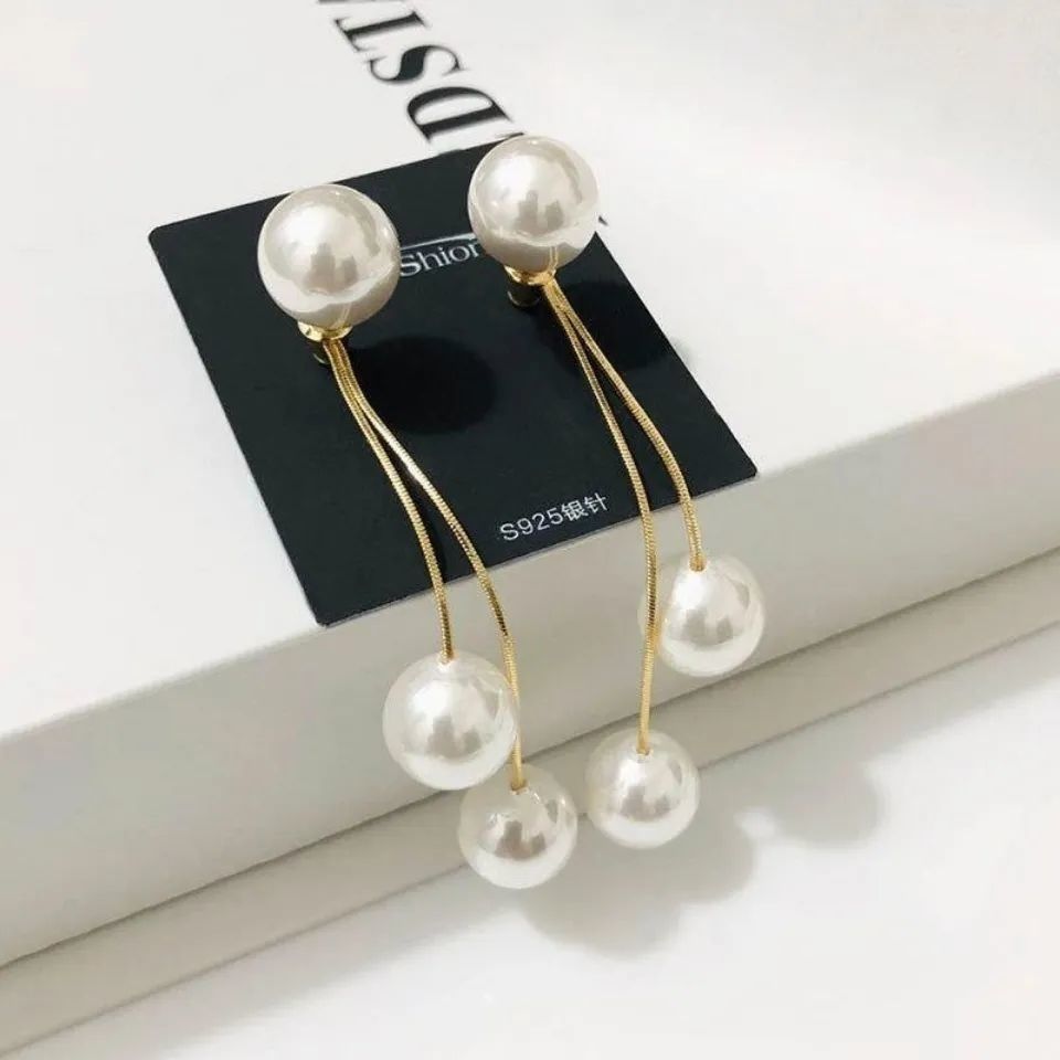 Trendy and Versatile Long Tassel Pearl Earrings 925 Korea Dongdaemun New Pearl Long Earrings