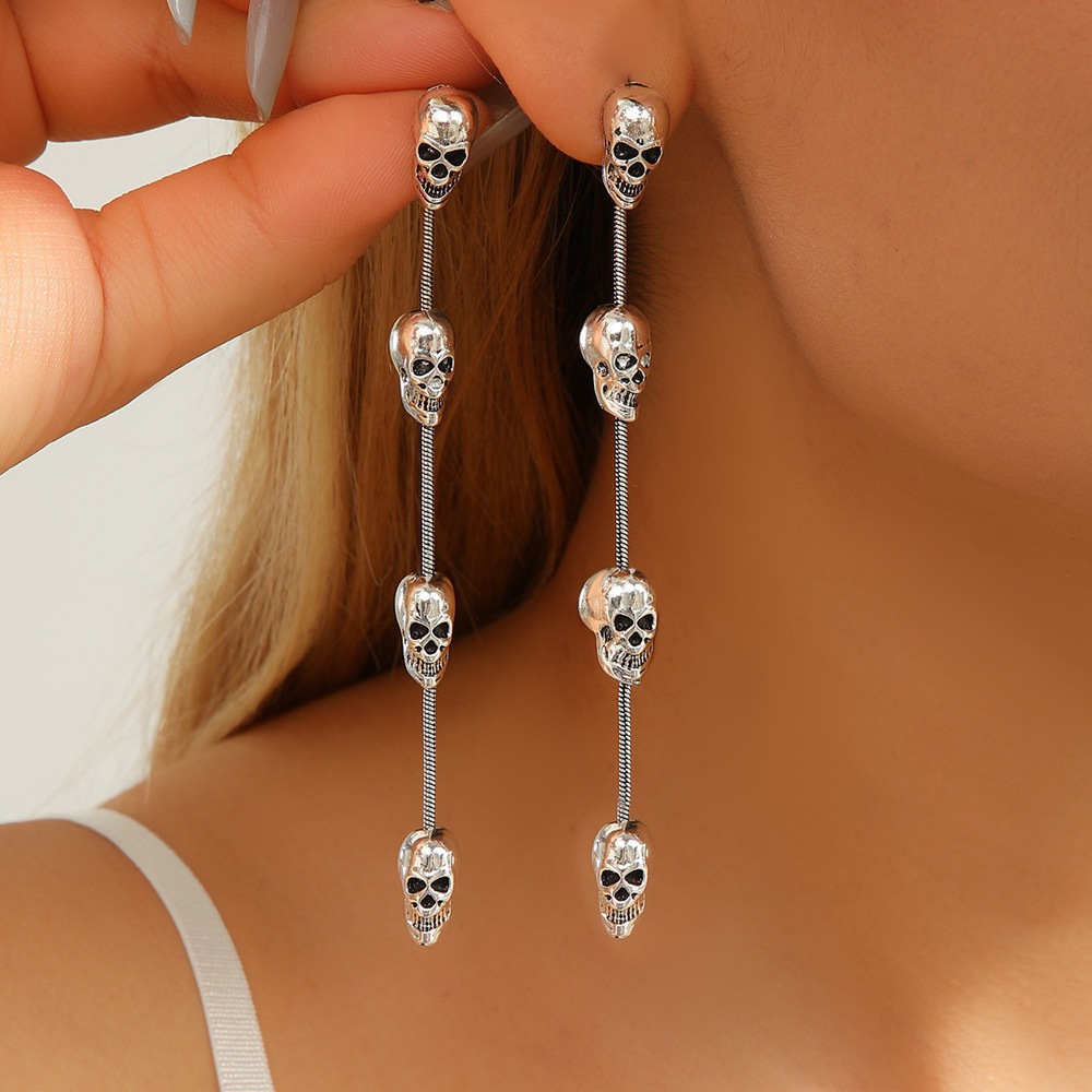 Cross-Border Halloween Earrings, Personalized Punk Retro Alloy Electroplated Skull Tassel Long Earrings for Women