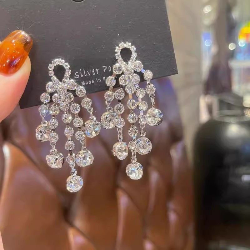 925 Silver Needle South Korea Dongdaemun Rhinestone Super Flash Show Dress Earrings Fan-shaped Tassel Earrings Slimming High-end Sense