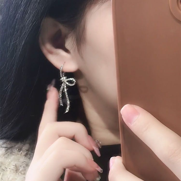 Full Diamond Bow Ribbon Earrings Heavy Industry High-end Light Luxury Elegant Elegant Ear Buckle Niche Design All-match Western Style Earrings