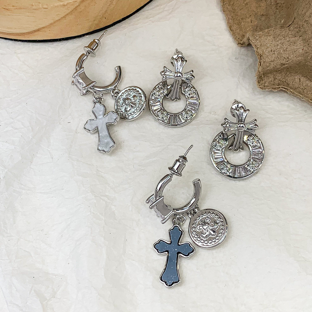 European and American niche personality hip-hop punk style cross heart earrings asymmetric color contrast high sense ear jewelry