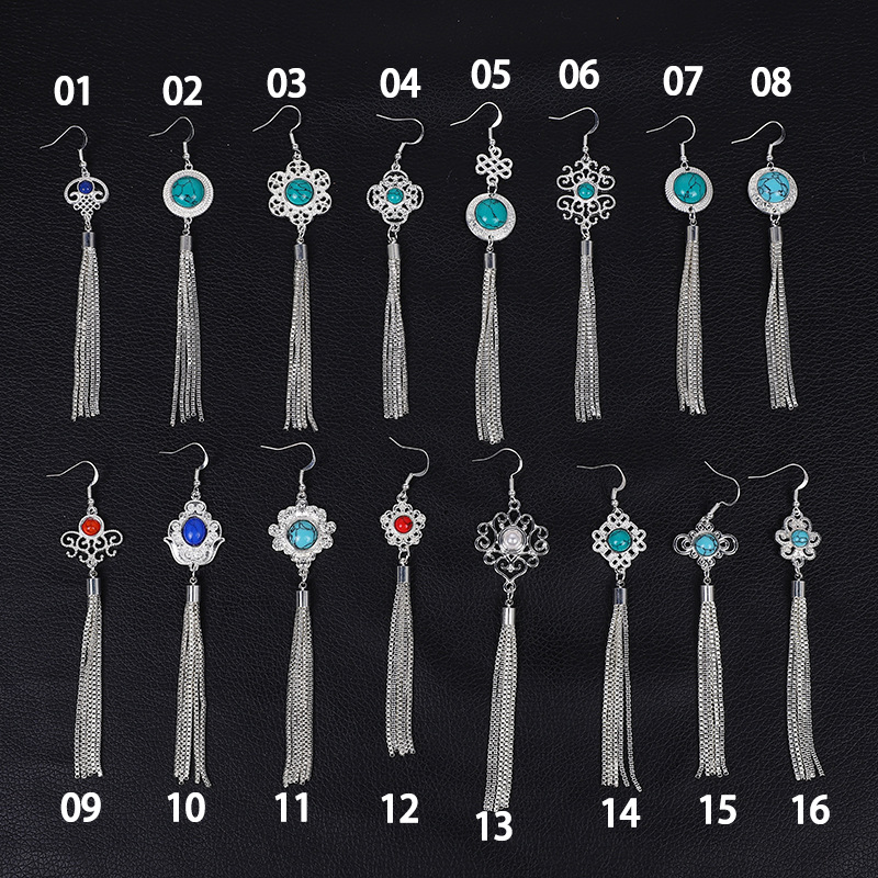 Mongolian element turquoise earrings female characteristic ethnic style tassel earrings Xizang Mongolian long earrings manufacturer
