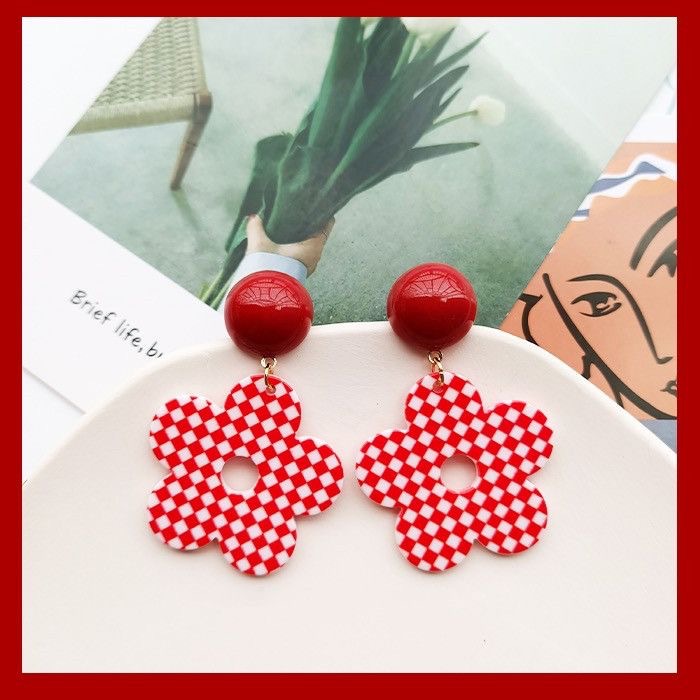 Nostalgic Hong Kong style retro red and white plaid flower earrings antique sense playful girl cute Japanese ear clip earrings