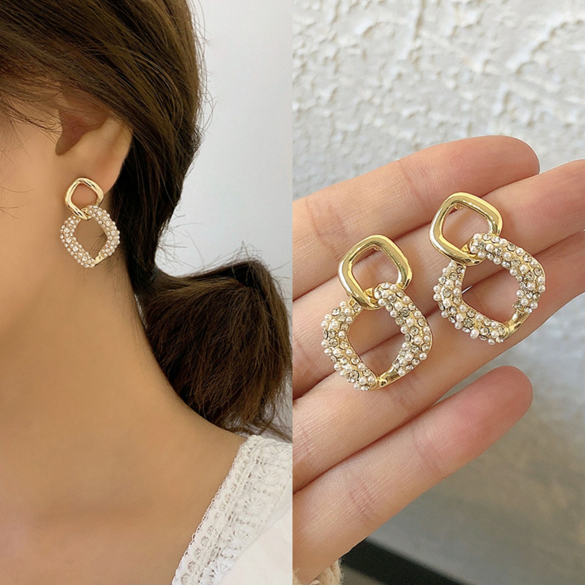 French Simple High-end Ear Drop Luxury Twist Pearl Geometric Diamond Earrings ins Style Elegant Slimming Earrings