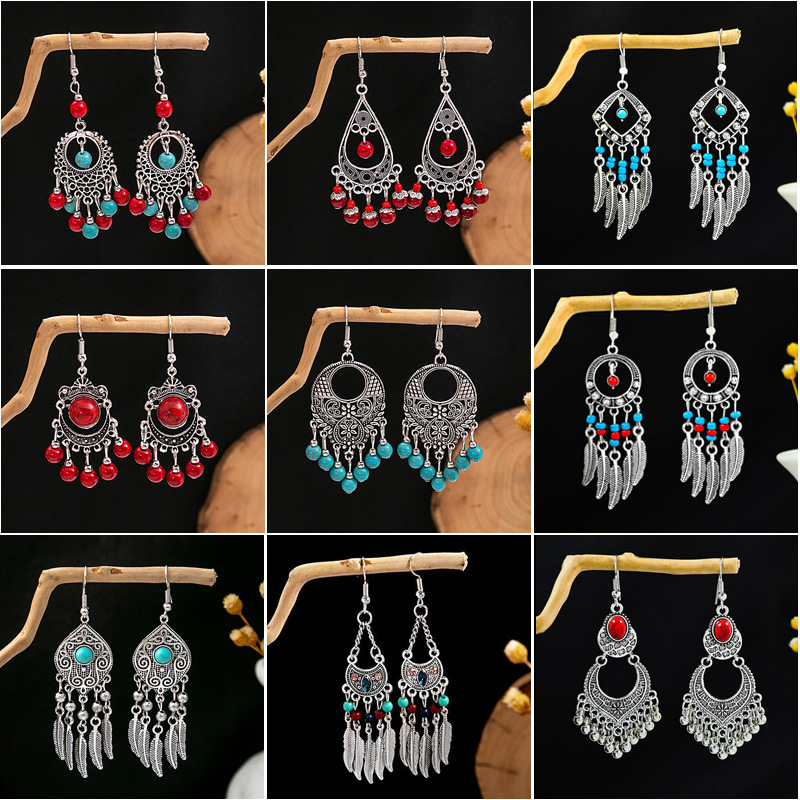 European and American Retro Round Hollow Ethnic Earrings Bohemian Tourist Attractions Turquoise Tassel Earrings Women