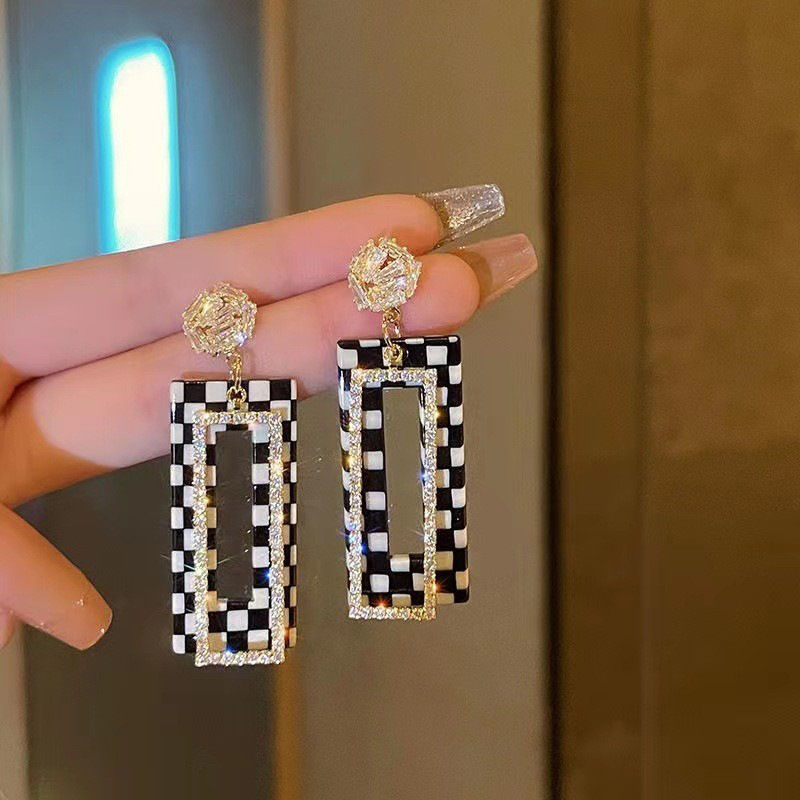 Rectangular Diamond-Encrusted Black and White Checkered Acrylic Earrings 925 Silver Needle Trapezoidal Zircon High-End Fashion Popular Earrings