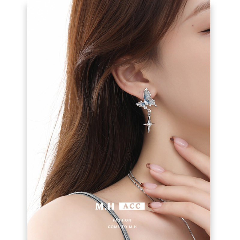 925 Silver Needle Blue and White Oil Dropping Butterfly Earrings Cold Temperament High-grade Sense Zircon Earrings Exquisite All-match Earrings for Women