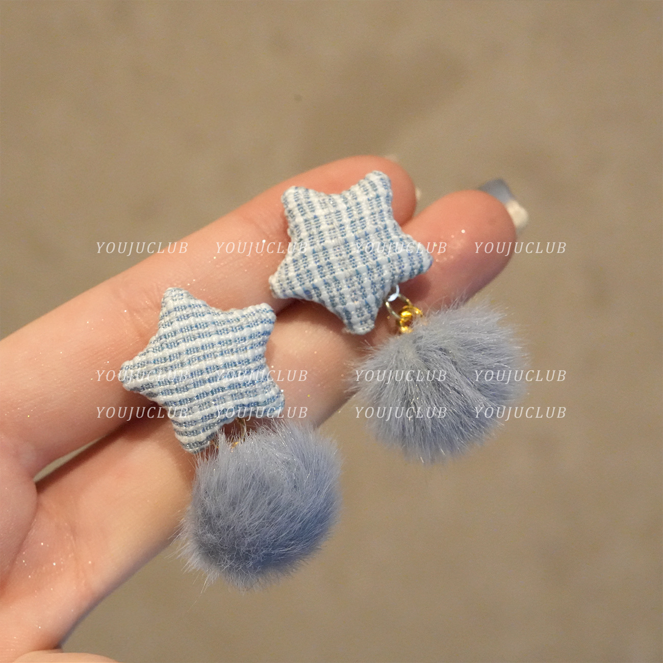 Autumn and winter five-angle stars pink blue mink fur ball earrings women's new heart furry sweet cute earrings