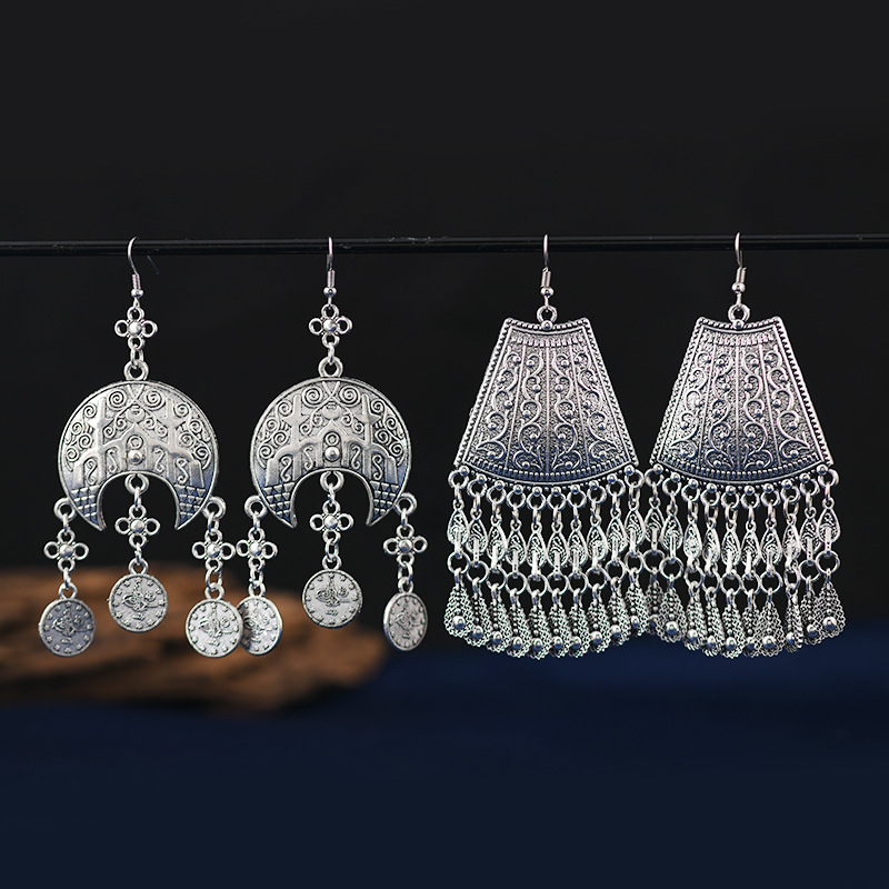Retro Ethnic Style Tassel Earrings Yunnan Tourism Miao Imitation Silver Earrings Bohemian High-End Exaggerated Earrings