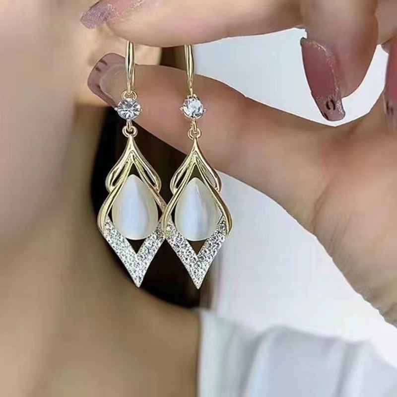 Popular Earrings, New High-End Ear Hooks, Green Cat's Eye Stone Rhombus Earrings, Niche Light Luxury Design Earrings