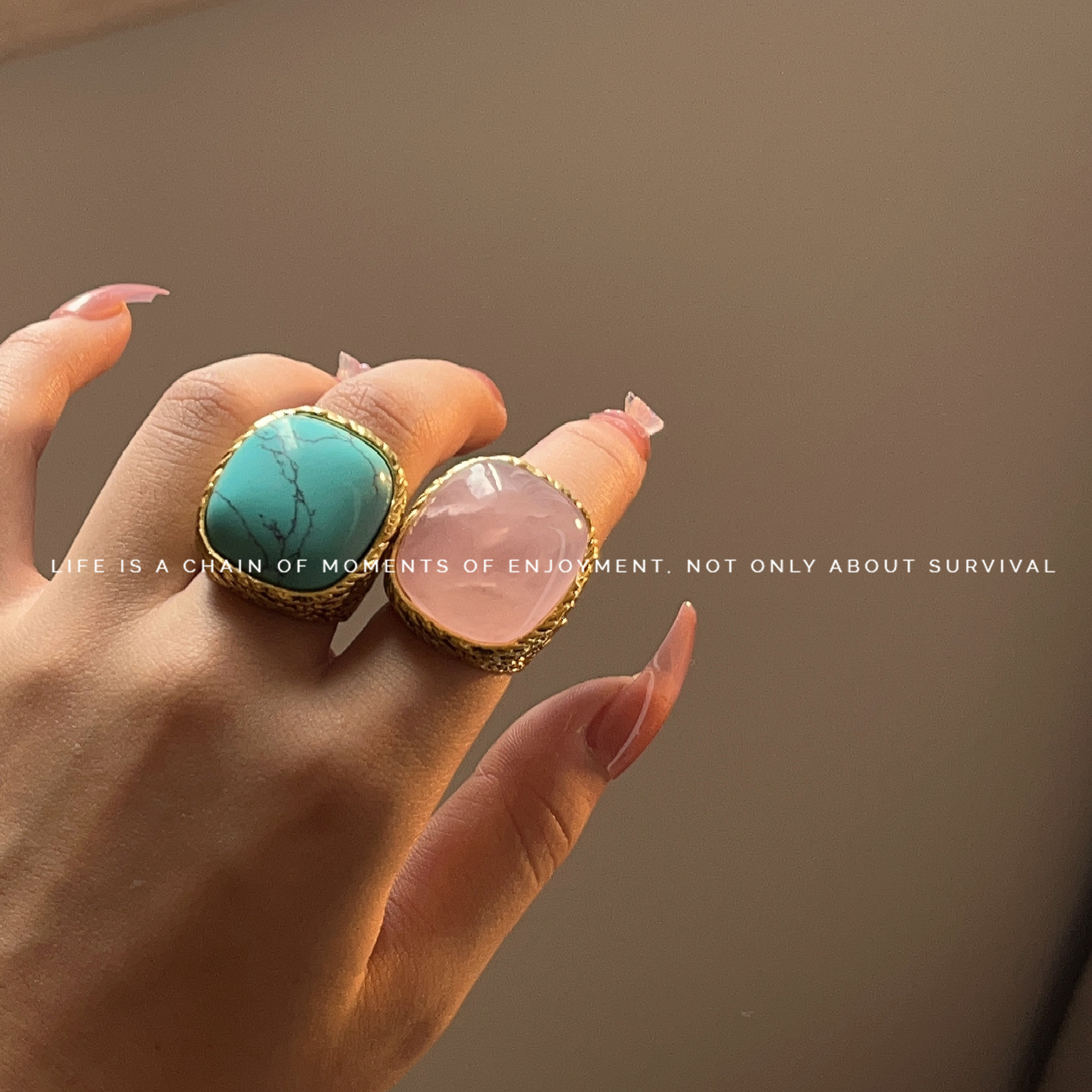 French niche design AB pink crystal ring female fashionable retro metal exaggerated turquoise index finger ring