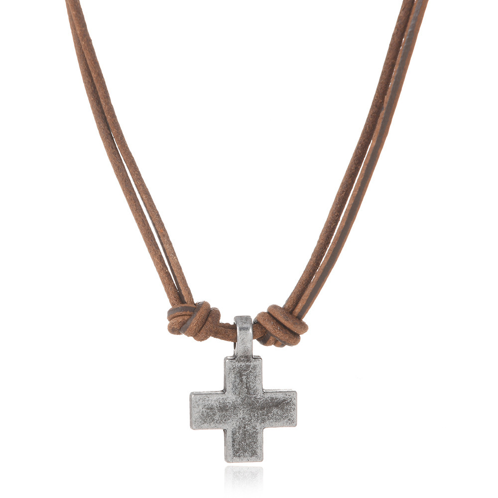 Vintage Handmade Cowhide Rope Necklace Alloy Cross Pendant Men's and Women's Simple Personality Creative Jewelry Short Necklace
