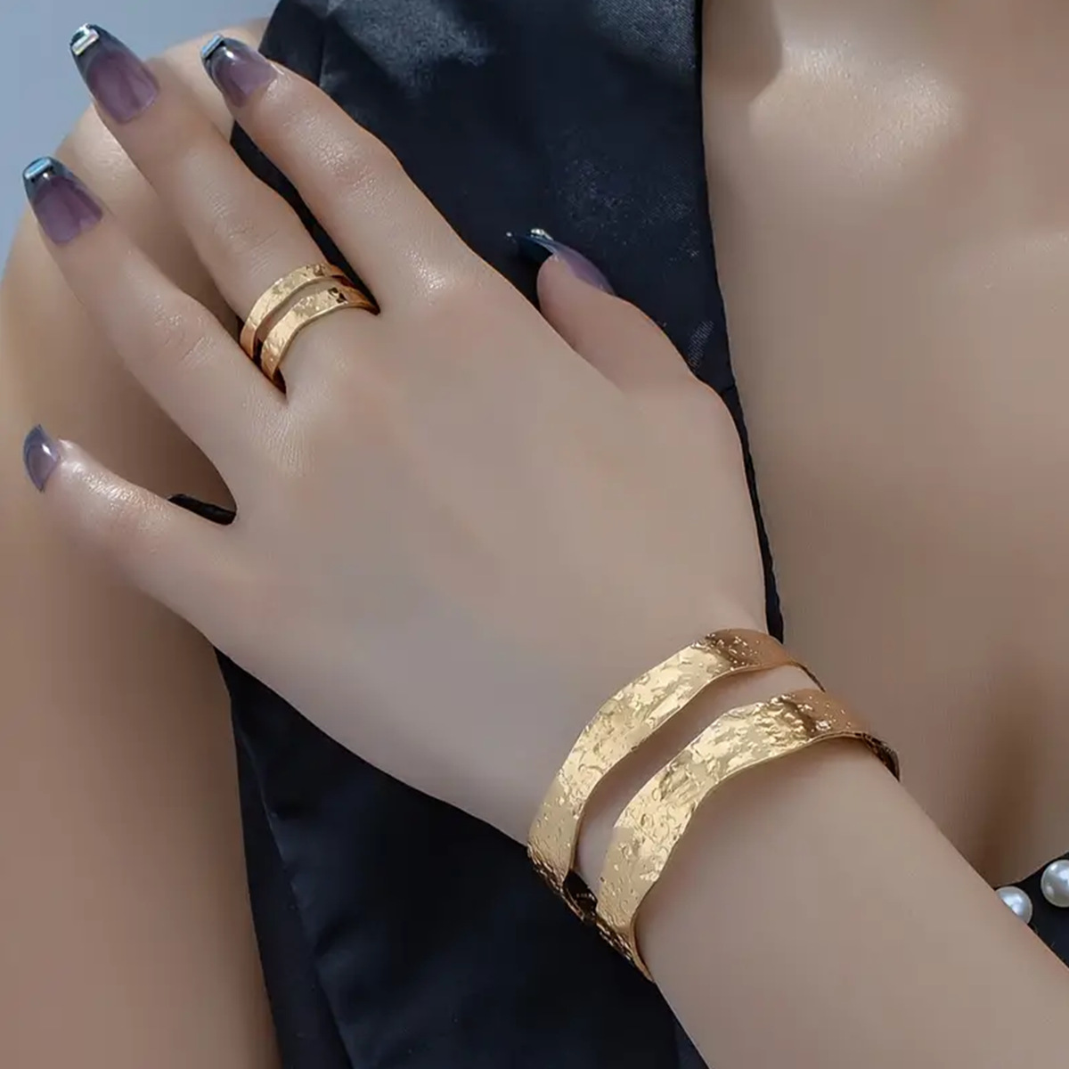 European and American temperament double-layer open bracelet women's hammer design cold style metal texture adjustable bracelet and ring