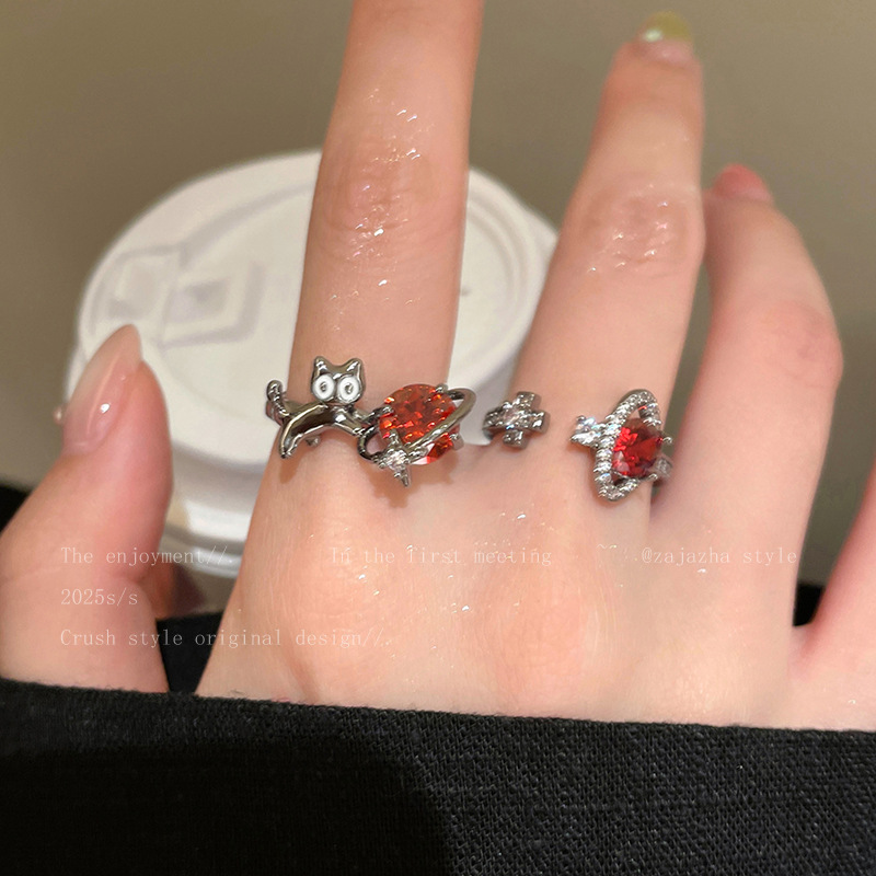 Childlike and Cute Dark Style Cat Red Diamond Ring for Women Retro Trendy Open Personalized Exquisite Ring for Women