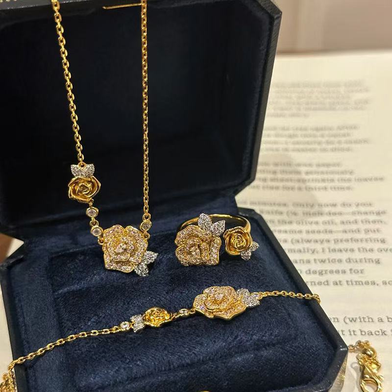 French Style Retro Diamond Twin Rose Necklace Women's Light Luxury Elegant Camellia Bracelet Xiao Xiang Family Old Flower Ring