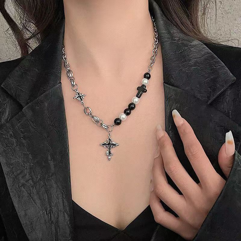 New Dark style cross beaded necklace women's fashion high-end European and American style hip hop clavicle chain all-match sweater chain