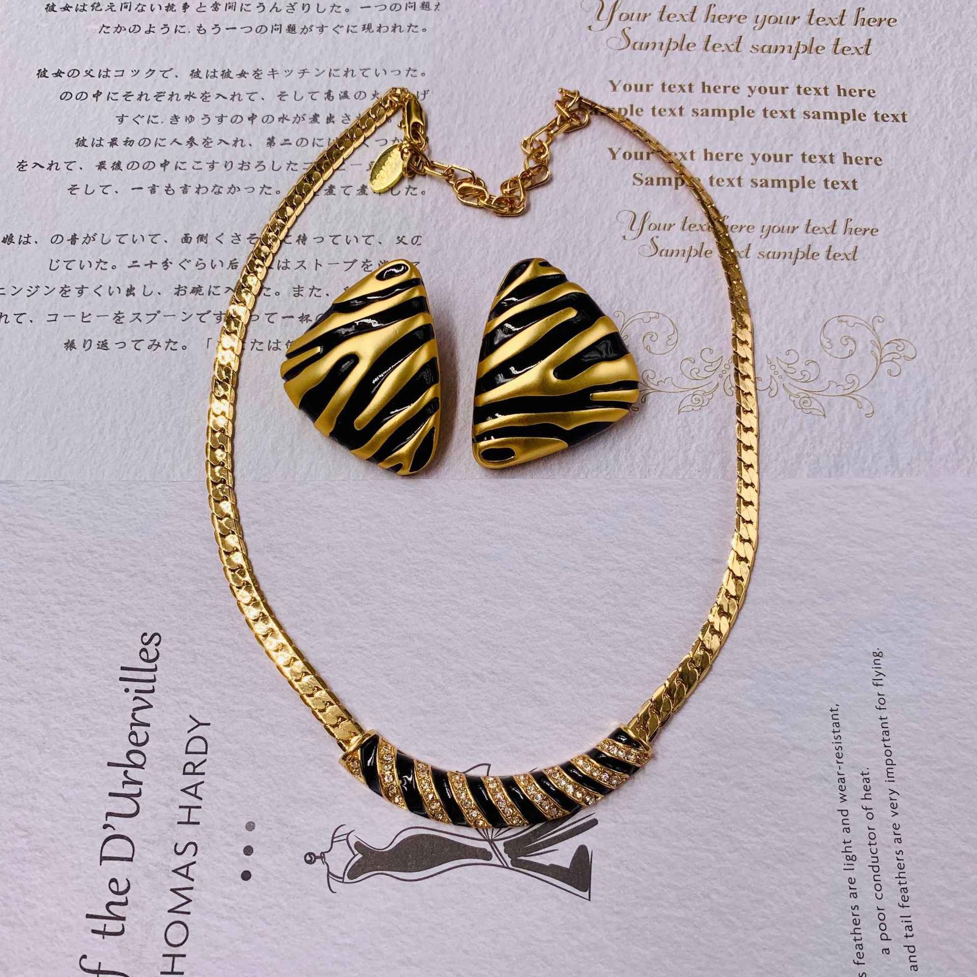 Middle Ancient vintage Western Court Zebra Pattern Set Electroplated Real Gold Enamel Full Diamond Set Earrings Necklace
