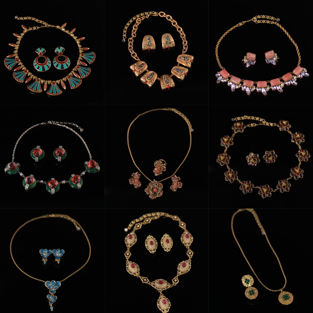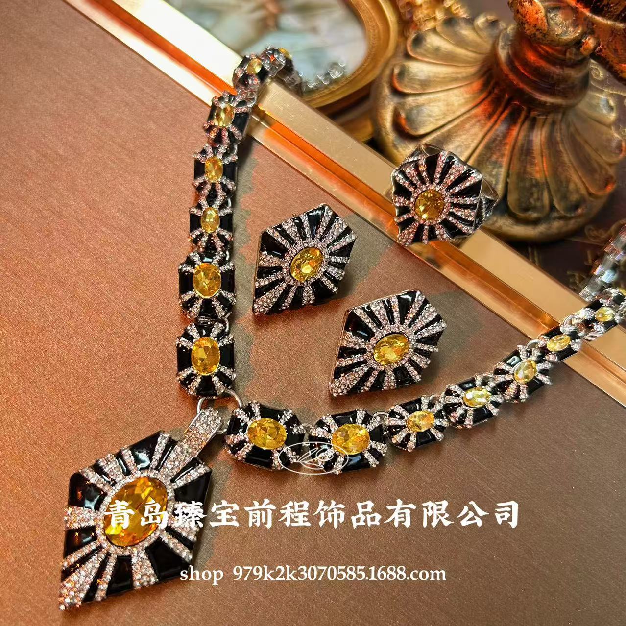 European and American Oil Dripping Geometric Splicing Necklace, Fashionable and High-End Palace Style Clavicle Chain Niche Design Jewelry Set for Women