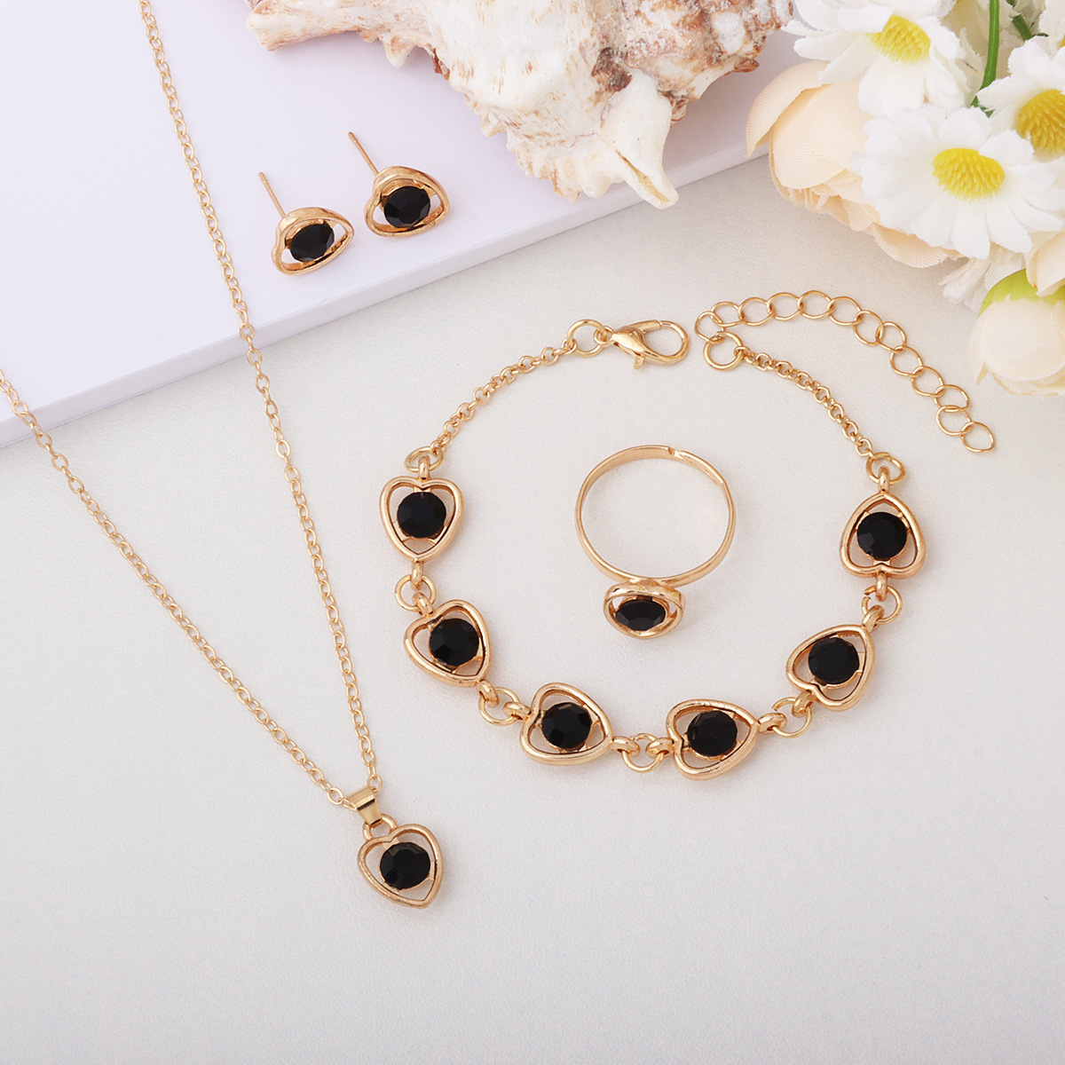 Cross-Border European and American Crystal Love Jewelry Fashionable Peach Heart Necklace Earrings Ring Bracelet Four-Piece Set Wholesale