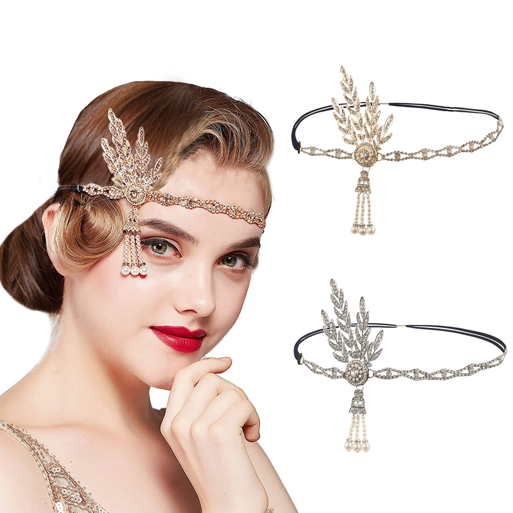 1920S Flapper Party Masquerade Women's Decoration Gatsby Feather Alloy Headband Pearl Necklace
