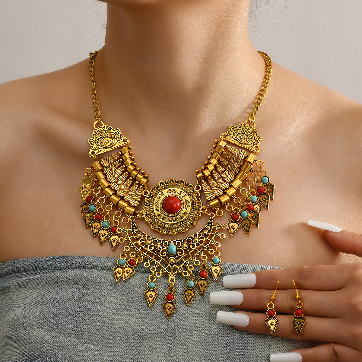 European and American Cross-Border Hot-Selling Retro Ethnic Style Clavicle Chain Water Drop Tassel Sweater Chain Necklace Earrings Manufacturer Wholesale