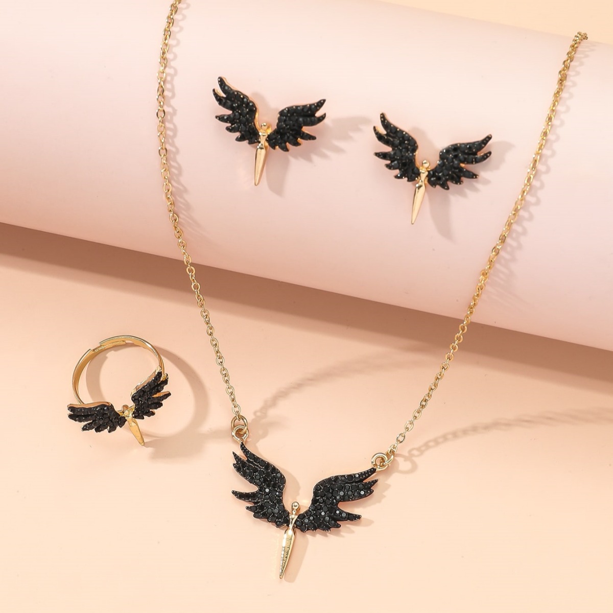 4 Pc Cross Border Punk Black Crystal Angel Wings Women Fashion Stud Earrings Ring Necklace suit Prom Gift