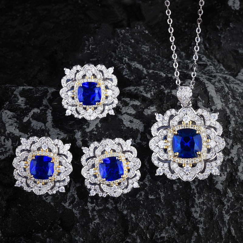 European and American Retro High-End Flower Tanzanite Jewelry Blue Ring Princess High Carbon Necklace Colorful Treasure Earring Set Diamond Jewelry