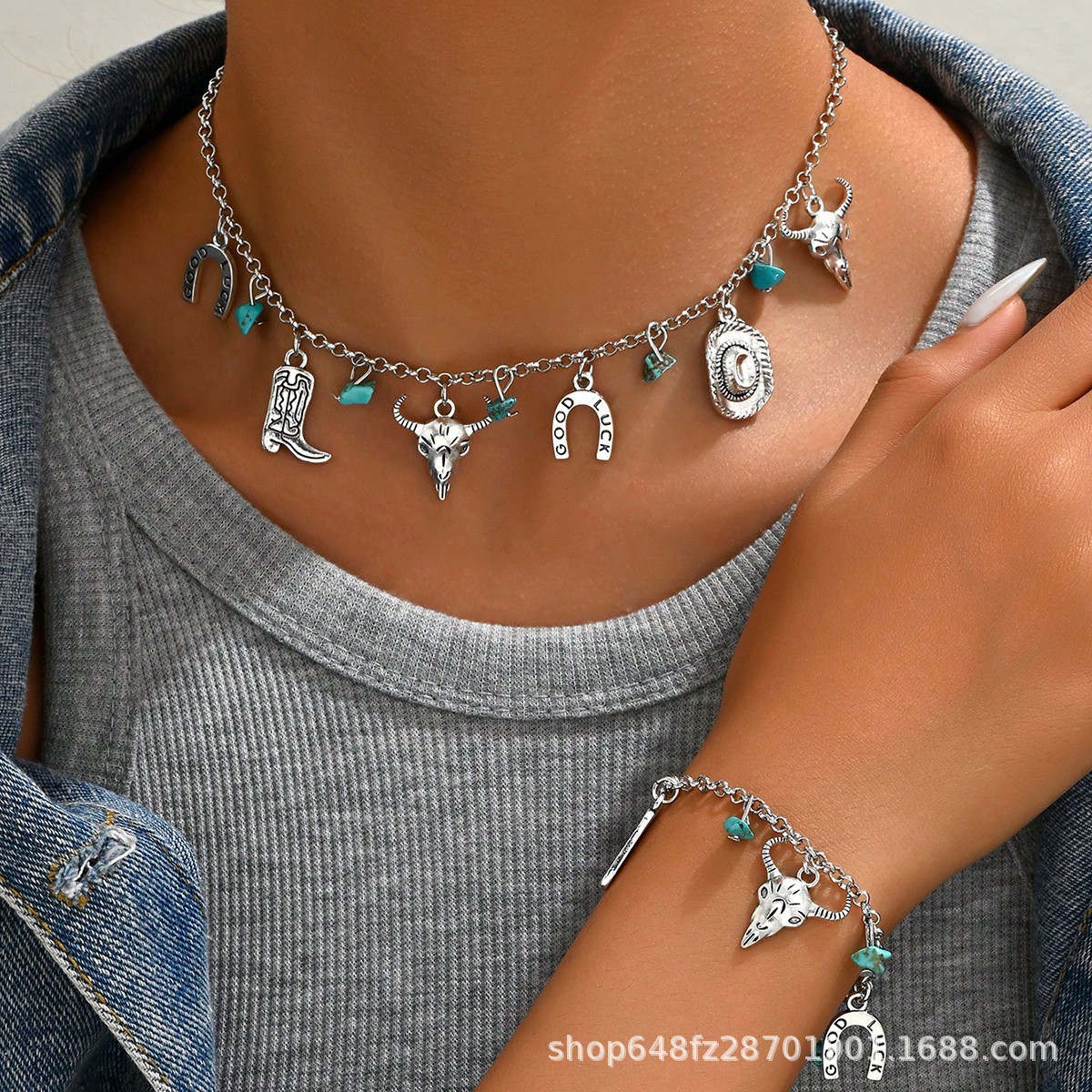 Cowboy Style Hat Boots Bull Head Horseshoe Turquoise Bracelet Necklace Set Women's Multi-Pendant Necklace Hand Jewelry