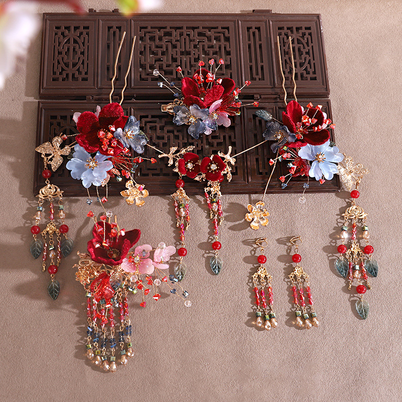 New Chinese Style Xiuhe Velvet Flower Hairpin Hairpin Set Red Festive Bride Toast Dress Dressing Gown Hair Accessories Headdress for Women