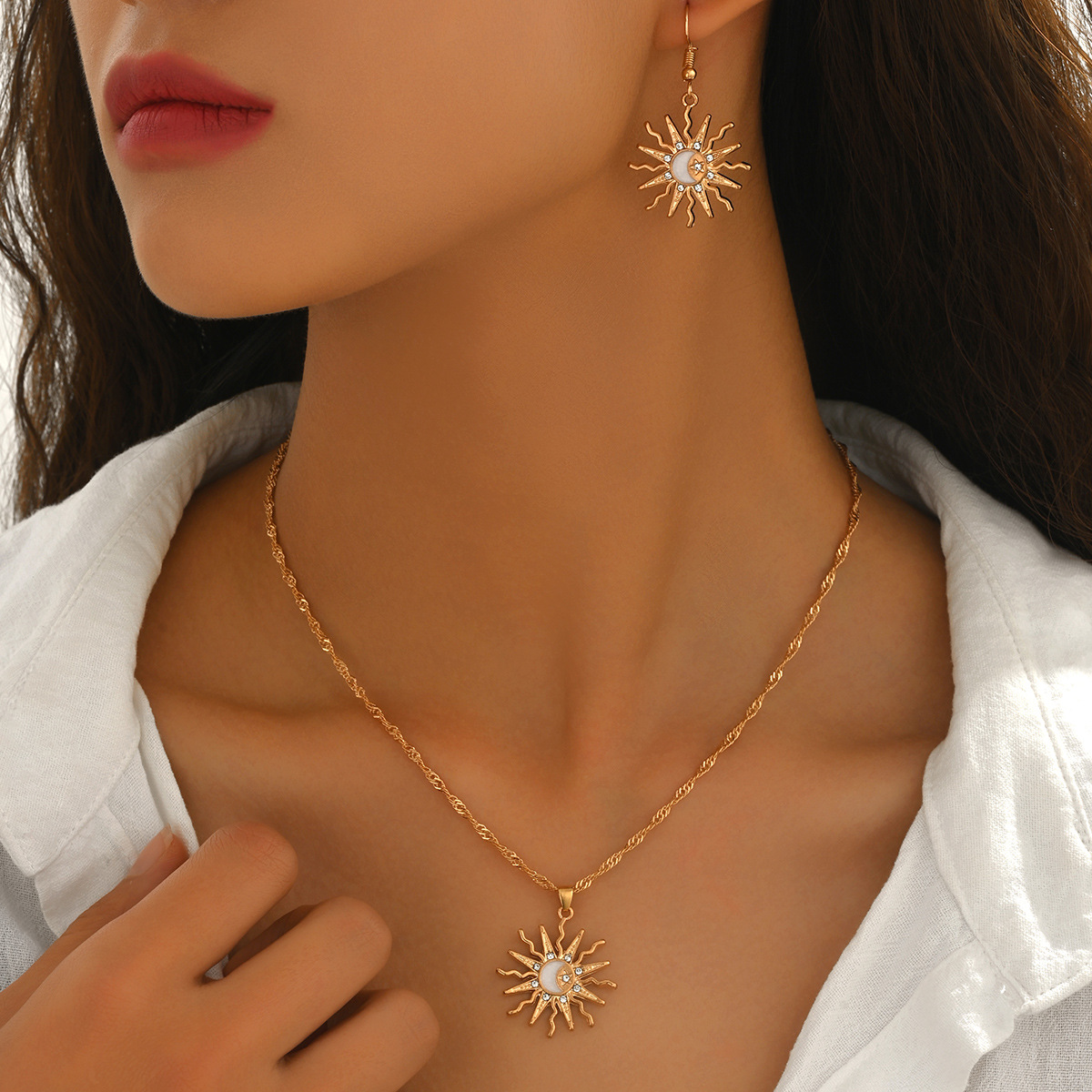 Cross-Border Middle East New Retro Sunflower Jewelry Set Creative Star Moon Sun Full Diamond Oil Drop Earrings Necklace