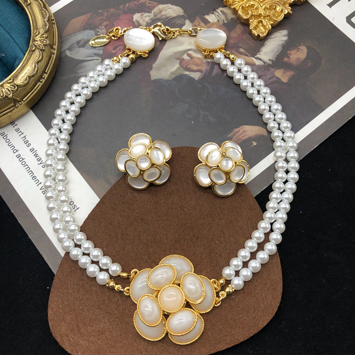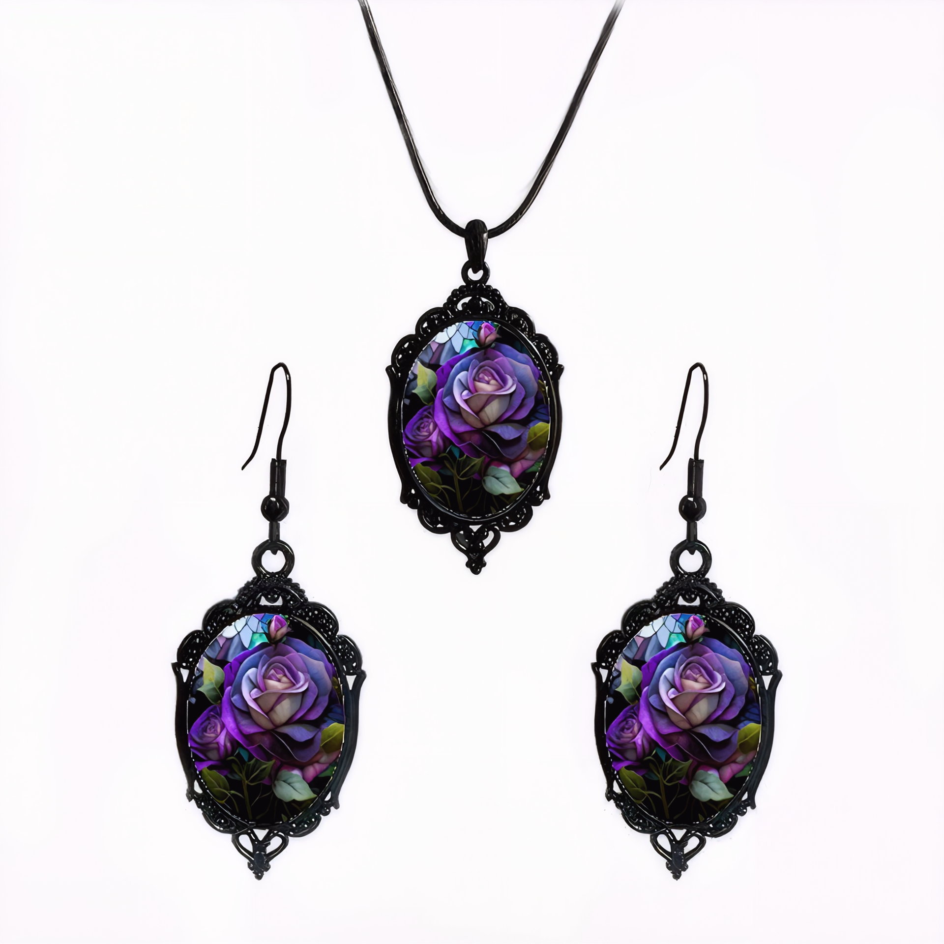 Cross-Border New Product Flower Pattern Black Frame Glass Pendant Earrings Necklace Set Factory Direct Sale