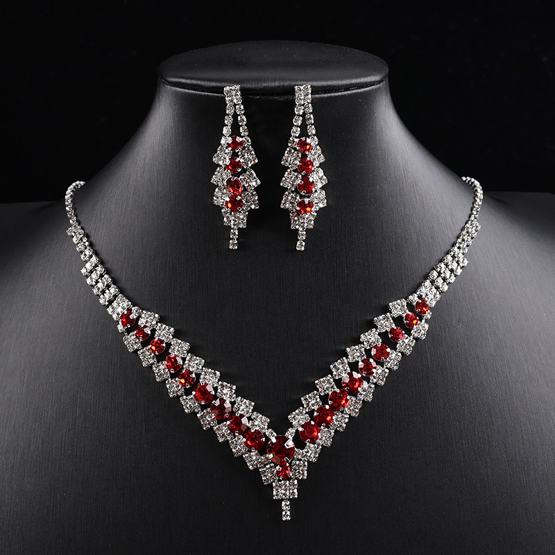 European and American Cross-border wine red Necklace suit Earrings Jewelry suit Fashion All-match Bride Rhinestone Jewelry Pendant