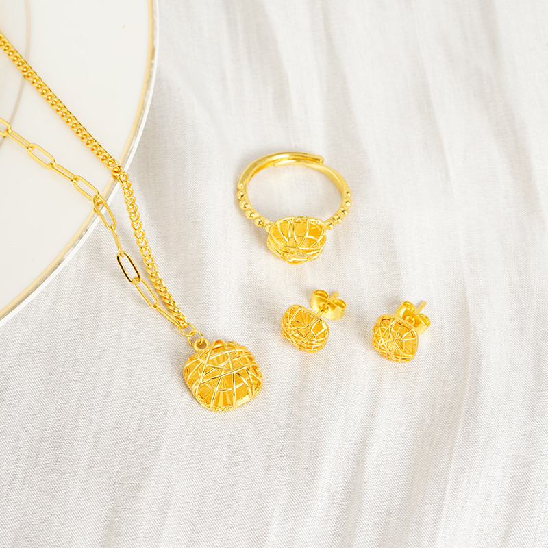 Vietnamese Sand Gold Small Sugar Cube Cut Out Dream Catcher Clavicle Necklace Women's Earrings Ring Long-Lasting Jewelry Set