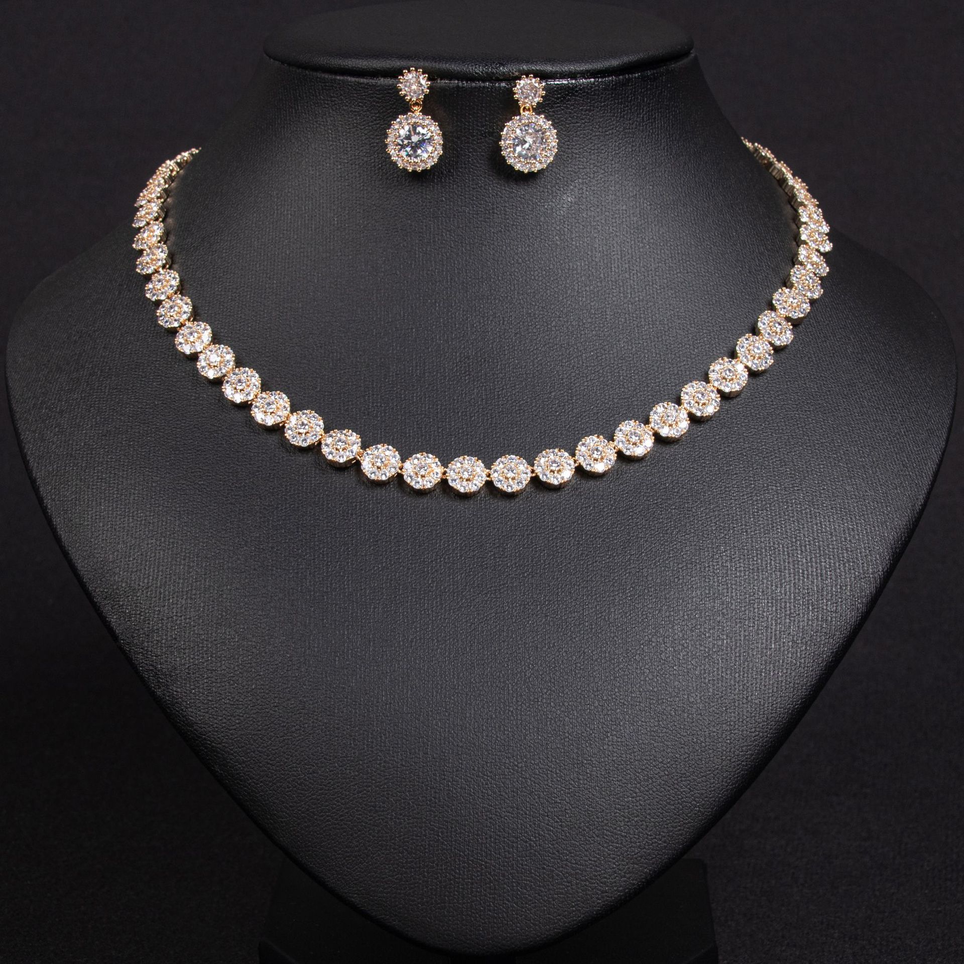 New Brilliant Full Diamond Zircon Necklace Earrings suit Bride Wedding Jewelry Temperament Simple All-match suit Wholesale